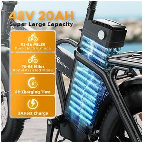 Condução segura e confortável: A bicicleta elétrica adota freio de desligamento automático EABS + freios a disco duplos dianteiros e traseiros para frenagem sensível. Ela foi projetada com forte desempenho off-road, força de frenagem confiável e alto fator de segurança. O garfo dianteiro e o canote de selim de alta resistência absorvem os solavancos de estradas longas e irregulares. Os pneus largos de 20" são antiderrapantes e à prova de furos, garantindo que você possa pedalar em estradas, neve, praias e estradas montanhosas acidentadas.