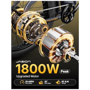 A bicicleta elétrica Jasion EB7 2.0 preta obsidian é uma fat bike elétrica para adultos com pneus 26x4, quadro em alumínio e motor elétrico traseiro com potência de pico em torno de 1800W, projetada para uso urbano, estradas de terra, neve, areia e percursos mistos. A bateria de íons de lítio de 48V 18Ah, com energia total próxima de 864Wh, é removível e recarregável, oferecendo autonomia de até cerca de 80 km em modos de assistência mais econômicos, conforme o nível de assistência, o relevo e o peso do usuário.