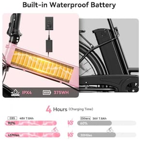 O kit Jasion EB6 inclui duas bicicletas elétricas dobráveis para adultos, desenvolvidas para uso urbano e lazer, com quadro em alumínio e motor elétrico de pico 1000W em cada unidade. A bateria embutida removível de íons de lítio 48V com 375Wh oferece autonomia de até cerca de 72 km em modo de assistência de pedal, com velocidade máxima aproximada de 37 km/h, variando conforme peso do usuário, modo selecionado e tipo de terreno.