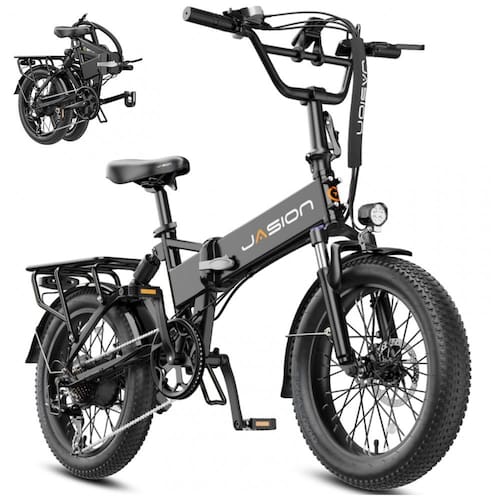 A bicicleta elétrica dobrável Jasion EB7 preto profundo é uma e-bike compacta com pneus largos 20x3, indicada para uso adulto em deslocamentos urbanos, estradas de cascalho, neve leve e percursos recreativos em diferentes tipos de terreno. O quadro em aço carbono com sistema de suspensão dianteira e traseira, combinado aos pneus fat resistentes a furos, contribui para maior estabilidade, conforto e absorção de impactos em pavimento irregular, guias e trilhas leves.
