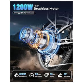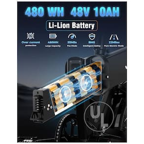 O conjunto utiliza motor traseiro brushless com potência de pico em torno de 1200W (aprox. 1,61 HP ou 1,63 CV), torque de cerca de 55Nm e velocidade máxima próxima de 45 km/h, permitindo enfrentar aclives de até aproximadamente 25° com apoio do motor. A bateria de íons de lítio de 48V e 10Ah, com energia de 480Wh, é removível, possui certificação UL e oferece autonomia em torno de 35 a 55 km em modo de assistência ao pedal, variando conforme o modo de uso, relevo e peso do ciclista.