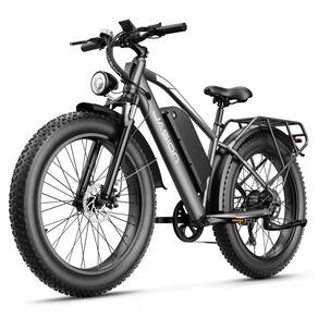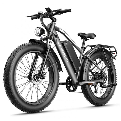 A bicicleta elétrica Jasion EB5 MAX cinza é uma e-bike de montanha com pneus largos 26x4, projetada para uso adulto em trilhas, estradas de terra e deslocamentos urbanos de média distância. O quadro em aço carbono com suspensão dianteira e pneus fat proporciona maior estabilidade, tração e absorção de impactos em superfícies como areia, lama, cascalho e pavimento molhado.