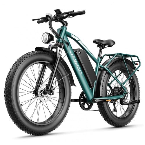 A bicicleta elétrica Jasion EB5 MAX verde é uma e-bike de montanha com pneus largos 26x4, desenvolvida para uso adulto em trilhas, estradas de terra e deslocamentos urbanos de média distância. O quadro em aço carbono com suspensão dianteira e pneus fat proporciona maior estabilidade, tração e absorção de impactos em superfícies como areia, lama, cascalho e pavimento molhado.