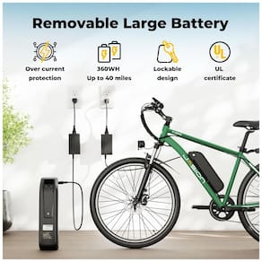 A bicicleta elétrica Jasion EB5 na cor verde é indicada para uso adulto em deslocamentos urbanos e trajetos com relevo variado, combinando motor elétrico brushless com potência nominal de 350W e pico de 1000W com quadro em aço carbono de alta resistência. A bateria de íons de lítio removível com 360Wh oferece autonomia estimada entre 40 e 64 km por carga, com tempo de recarga em torno de 5 a 6 horas, adequada para uso diário em percursos de ida e volta.