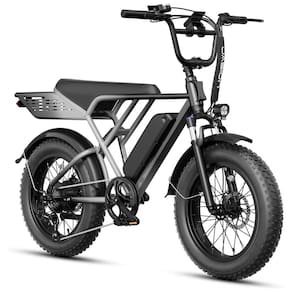 A bicicleta elétrica Jasion RetroVolt na cor prata-cinza utiliza estrutura em aço carbono alto carbono com motor brushless traseiro de 750W, capaz de atingir pico de 2000W e torque de 99 Nm para velocidades máximas de 48 km/h conforme modo de assistência e condições do terreno. Os pneus fat tire 20 x 4 proporcionam tração em superfícies variadas como asfalto, terra, cascalho, areia e neve leve, enquanto a suspensão dupla absorve vibrações para maior estabilidade em percursos urbanos e off-road leve.