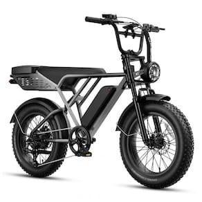 A bicicleta elétrica Jasion RetroVolt Pro na cor cinza degradê utiliza estrutura em aço carbono de alta resistência com motor brushless de 750W que atinge pico de 3000W, oferecendo torque elevado para velocidades máximas de 61 km/h conforme modo de assistência e condições do percurso. Os pneus fat tire 20 x 4 proporcionam tração otimizada em asfalto, terra, cascalho e terrenos irregulares, enquanto a suspensão dupla absorve vibrações para condução estável em uso urbano e off-road.