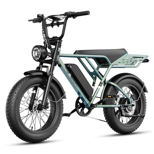 A bicicleta elétrica Jasion RetroVolt Pro na cor verde utiliza estrutura em aço carbono alto carbono com motor brushless de 750W alcançando pico de 3000W, proporcionando torque elevado para velocidades máximas de 61 km/h conforme modo de assistência e características do terreno. Os pneus fat tire 20 x 4 garantem tração em múltiplas superfícies incluindo asfalto, terra, cascalho, neve e trilhas off-road, com suspensão dupla que absorve vibrações para condução estável em uso urbano e rural.