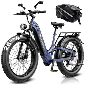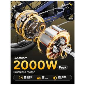 A bicicleta elétrica Jasion Thunder azul cobalto é uma fat bike elétrica para adultos com pneus 26x4, quadro em alumínio e motor traseiro brushless de 750W de potência nominal e 1800W de potência de pico, indicada para uso em cidade, estradas de terra, neve, areia e trilhas leves. A bateria de íons de lítio de 48V 18Ah, com 864Wh de energia, é removível e foi projetada para oferecer autonomia de até cerca de 80 km em modos de assistência mais econômicos, variando conforme o nível de assistência, o relevo e o peso do usuário.
