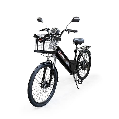 Painel digital em LCD com exibição de: indicador de nível de bateria, velocímetro, hodômetro, painel de tensão de bateria e parada (P)Acelerador na manoplaPedais: Pedal assistido (pedal system)Cesta dianteira com travaBanco ergonômico com molasItens inclusos: