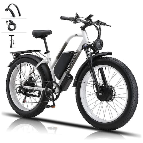 E-bike QIKAITU Q7 com motor duplo de 2000 W e bateria 48V 23Ah com certificação UL2849. Autonomia de até 96 km, suspensão hidráulica dupla, pneus largos de 10 cm, faróis de 500 lúmens e 4 modos de condução. Suporta até 136 kg. Ideal para trilhas e deslocamentos urbanos.