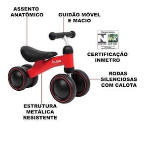 A Bicicleta de Equilíbrio 4 rodas da Buba estimula o equilíbrio e a coordenação motora do pequeno na fase de desenvolvimento de forma divertida e segura. É estável, pois possui rodas duplas na frente e atrás. A criança aprende desde cedo a se equilibrar e adquirir autoconfiança, facilitando a transição para a bicicleta com pedais.