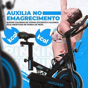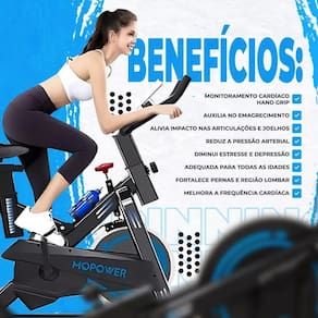 Bicicleta Ergométrica Spinning Mopower 2.0 - Alto Desempenho, Conforto e Resistência em um Só Equipamento A Bicicleta Ergométrica Spinning Mopower 2.0 é a escolha ideal para quem busca um treino indoor de alto desempenho, proporcionando uma experiência de ciclismo profissional no conforto de casa. Com estrutura em aço carbono ultrarresistente, ela suporta até 150 kg, garantindo máxima estabilidade e durabilidade. Seu volante de inércia de 17 kg proporciona uma pedalada fluida e intensa, simulando treinos de ciclismo profissional. Este modelo de bicicleta spinning foi desenvolvido para garantir o máximo de conforto e eficiência. Seu design compacto ocupa pouco espaço, sendo perfeito para ambientes menores. Além disso, possui ajustes personalizados no assento e guidão, adequando-se a diferentes estaturas e garantindo a postura correta durante os exercícios. Ideal para quem deseja treinos completos, a Mopower 2.0 é projetada para a prática de spinning, uma atividade que oferece excelente , melhora da resistência cardiovascular e tonificação muscular. O monitor LCD exibe informações como tempo, velocidade, distância, calorias queimadas e batimentos cardíacos, proporcionando controle total sobre o seu desempenho. Características: Cor: Preto com Azul Material: Ferro, plástico, espuma, material sintético Tipo de bicicleta: Spinning Tipo de resistência: Mecânica Inércia: 17 kg Funções do display: Scan, tempo, velocidade, distância, calorias, hodômetro e batimentos cardíacos Alimentação do display: 2 pilhas AAA  não inclusas  Ajustes personalizados: Assento e guidão ajustáveis em altura e profundidade Sistema de transmissão por correia: Silencioso e suave Amortecimento avançado: Reduz impacto nas articulações Rodinhas para transporte: Fácil deslocamento Peso máximo suportado: 150 kg Altura indicada: Até 1.90 m Dimensões: Comprimento: 103 cm Largura: 52 cm Altura: 120 cm Peso total: 36 kg A Bicicleta Ergométrica Spinning Mopower 2.0 é perfeita para quem deseja treinar no próprio ritmo, evoluir com conforto e conquistar seus objetivos. Com ajustes completos, ela é versátil para diferentes usuários, oferecendo segurança e conforto durante os treinos. Adquira já a sua e transforme seu treino diário em uma experiência completa e desafiadora