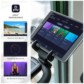 A experiência do JRNY avalia seu nível de condicionamento físico, cria exercícios adaptativos diários que se ajustam automaticamente à medida que você melhora ao longo do tempo e fornece treinamento e feedback que o orientam nos seus exercícios Associação JRNY necessária Use com aplicativos populares de ciclismo de terceiros, como Peloton e Zwift, em seu smartphone, tablet ou TV inteligente e, com uma conta JRNY, durante seus exercícios, transmita métricas de bicicleta, como cadência e energia, para aplicativos de ciclismo compatíveis via conectividade Bluetooth Assinaturas de aplicativos de ciclismo não incluídas. Explore destinos em todo o mundo e descubra mais de 50 rotas globais que se ajustam automaticamente em tempo real à sua velocidade É necessária uma associação ao JRNY Resistência magnética com 100 níveis de resistência micro ajustáveis O console LCD retro iluminado colorido monitora a frequência cardíaca, velocidade, tempo, distância, calorias e RPMs Os pedais SPD de link duplo são padrão com gaiolas ou clipes e assento ajustável em estilo de corrida Guiador mergulhado em uretano com ajuste de 4 vias, suporte integrado para dispositivos multimídia e um par de halteres de 1,3 kg. Console LCD e resistência magnética alimentada por adaptador de parede