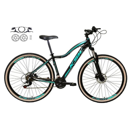 Bike aro 29 em alumínio, nova na caixa a pronta entrega, produto com ótima qualidade e acabamento, possui 24 marchas com sistema de alavancas rapid fire que a cada clique uma marcha é trocada, garfo com suspensão, sistema de freio a disco hidráulico(óleo). Quadro com tubo rebaixado para facilitar subir e descer da bike. Bicicleta pré montada, vai precisar apenas fixar a roda dianteira, guidão, selim e pedais. Segue abaixo características da bike: Quadro Feminina 29 Ksw Mwza em alumínio / Garfo 29 suspensão curso 60mm / Suporte do guidão em alumínio preto / Guidão 31.8mm em alumínio preto / Canote do selim 27.2 s/carrinho / Selim Sport preto / Abraçadeira do Selim alumínio Preto / Aros Aero Parede dupla reforçado / Raios Pretos / Cubos Pretos Aço / Pneus 29 cravudos / Movimento central selado rolamentado / Freios a disco Hidráulicos com discos inox 160mm / Alavancas Semi-automáticas Rapid Fire / Câmbio Traseiro Index Importado 8v / Câmbio Dianteiro Index Importado 3v / Corrente Index 24v / Pedivela Aço Revestido / Pedal Plataforma Nylon preto / Roda Livre 8v index dourada(rosca) / Recomendamos que seja feita uma revisão por um técnico após a recebimento do produto, para reajuste e regulagem, pois no transporte pode acontecer de alguma peça soltar ou desregulas / Fotos meramente ilustrativas