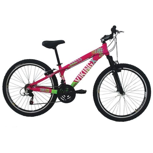 Bicicleta Freeride Aro 26 Freio V-Break 21 Velocidades Câmbios Shimano Rosa/Verde VikingX TUFF25 Foi projetada para quem quer uma bike de personalidade e estilo inigualável. Ela oferece ao ciclista quadro diferenciado e design arrojado e exclusivo. Com qualidade, ela vem equipada de com 21 velocidades, permitindo ao ciclista a escolha da marcha ideal de acordo com o . O design moderno pode ser observado no quadro da bike e os pneus são confeccionados em MTB com aro 26, garantindo segurança total a cada manobra em qualquer tipo de terreno. Informações Técnicas: - Marca: VikingX - Modelo: MTB Freeride - Coleção/Sortimento: 2017 - Idade Recomendada: Juvenil/Adulto - Gênero: Unissex - Aro: 26 - Quadro: Alumínio - Marcha: 21 Marchas - Garfo: Suspensão - Guidão: Aço carbono MTB - Freios: V-Brake - Rodas: Aero - Câmbio: Shimano - Manoplas: MTB - Corrente: Index - Selim: WG - Trocador de Marcha: Grip -Shift - Pedivela: - Pneus: MTB 26" - Pedal: Plástico MTB - Conteúdo da Embalagem: 1 bicicleta e manual de instruções - Peso: 15,90 kg - Dimensões aproximadas da embalagem (AxLxP): 109 x 68 x 165cm - : 3 meses