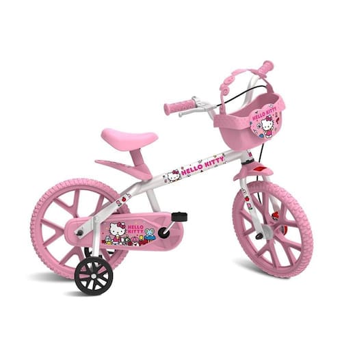Bicicleta Hello Kitty Aro 14 - Bandeirante Guidão com limitador de giro e regulagem de altura para melhor ergonomia. Manoplas em TPE atóxico. Pedivela de fácil manutenção. Selim anatômico com regulagem de altura. Freio dianteiro à tambor. Rodas com pneus em E.V.A. para melhor performance. Cobre corrente integral. Cestinha removível. Rodinhas laterais removíveis fixadas no quadro, que ajudam na conquista do equilìbrio e auxiliam na aprendizagem. Idade: +4 anos. Peso máximo suportado: 27kg. Selo Inmetro: CE-BRI/INNAC-00580-01A.