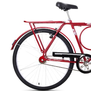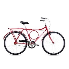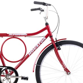 Características: Marca: Houston Modelo: Super Forte Aro: 26 em alumínio Quadro e guidão: Aço carbono Cesta: Aramada preta Paralamas: Aço carbono Selim: Largo com 2 molas Descanso lateral: Aço cromado Cubo dianteiro: 36 furos Freio: Sistema V-Brake Movimento central: 45mm Roda livre: 20 dentes Acessórios: Campainha, espelho, refletores e manuais