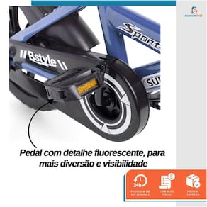 Especificações Técnicas: Aro: 12 polegadas Quadro: Triangular, garantindo maior estabilidade e segurança Pedal: Com detalhe fluorescente, para mais diversão e visibilidade Banco: Acolchoado, proporcionando conforto durante o passeio Para-lamas: Maiores, oferecendo maior proteção contra respingos Rodinhas laterais: Auxiliam no aprendizado e proporcionam mais segurança para as primeiras pedaladas Cesto: Ideal para carregar brinquedos e acessórios Freio traseiro: Proporciona controle adicional e segurança nas paradas