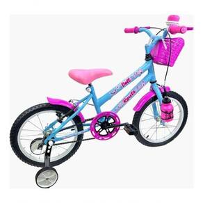 Bicicleta Infantil Aro 16 Feminina + Rodinhas Laterais Azul-celeste BICICLETA ARO 16 Com freios V-Brake e maçaneta em Nylon, garante uma ótima rigidez, fazendo com que a frenagem seja mais e? Ciente por não sofrer deformação.