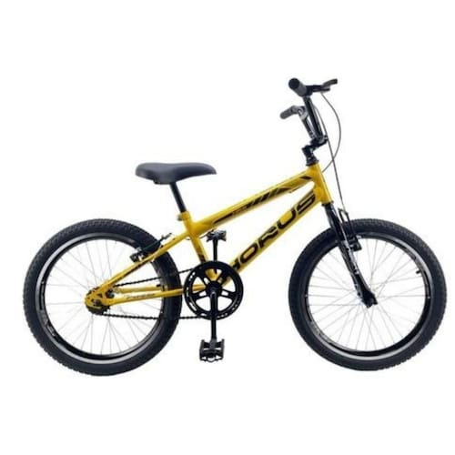 Bicicleta aro 20 ideal para iniciar passeios, suporta até 80 kg, com guidão cross, aro de alumínio e sistema de freio v-brake. Pré-montada, requer instalação parcial pelo cliente.