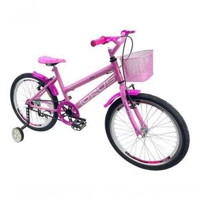 Bicicleta aro 20, ideal para iniciantes. Suporta até 80 kg, possui freio V-brake e vem com rodinhas de treinamento. Garantia de 90 dias. Peso: 11 kg, pedal e selim em nylon.