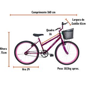 A Bicicleta Infantil Aro 24’ apresenta um design moderno com aros em alumínio reforçado, quadro em aço carbono, resistente e confortável, uma bike perfeita para as meninas que querem pedalar pelos parques e ciclovias da cidade com segurança e conforto. Além de divertir, pedalar aumenta a resistência, potencializa a velocidade e a agilidade, e ainda estimula e melhora a coordenação e o equilíbrio da criança.