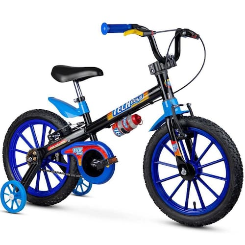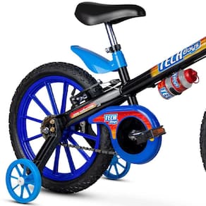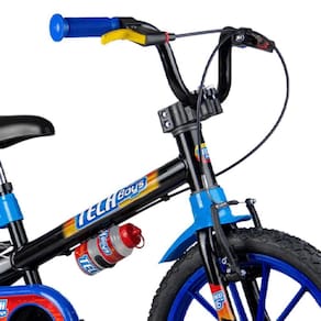 A Nathor é a maior fabricante de bicicletas infantis da América Latina, sendo também responsável pelo abastecimento de grandes marcas. A bicicleta Tech Boys Aro 16 possui limitador de giro do guidão, importante característica que evita que o guidão dê uma volta completa e danifique o freio, preservando a integridade física da criança. Com freios V-Brake e maçaneta em Nylon, garante uma ótima rigidez, fazendo com que a frenagem seja mais eficiente por não sofrer deformação. Outro detalhe importante é que o manete do freio traseiro está destacado na cor Amarela. Isso auxiliará seu filho no momento de frear, garantindo ainda mais segurança. Os pneus possuem câmara e o quadro é em aço carbono. Ela vem acompanhada de uma garrafinha. A Tech Boys Aro 16 fará a alegria dos meninos que querem diversão e aventura. - Mesa Head-Set com regulagem de ângulo - Paralama em ABS - Aro em ABS - Regulagem de altura das rodas laterais - Limitador de giro do guidão - Maçaneta em nylon reforçado e com ajuste do freio - Maçaneta: Cor em destaque para facilitar a identificação do freio traseiro. - Movimento de direção com - Arruela com trava de segurança - Pneus com câmara - Quadro, garfo e guidão em aço carbono - Abraçadeira Quick Release - Freios V-brake - Garrafinha - indicada para crianças a partir de 5 anos ou com altura entre 1,10 m e 1,20 m - Peso máximo suportado: 30kg Invista na segurança e diversão de seu filho Marca: Não Informado