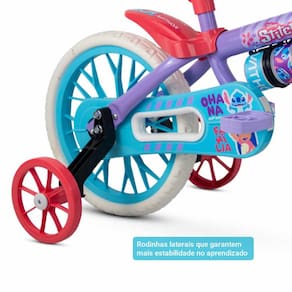 Bicicleta Infantil com Rodinhas - Aro 12 - Disney Stitch - Nathor: a Bicicleta Stitch Aro 12 é ideal para fãs da Disney que estão querendo se aventurar no universo das pedaladas. Projetada para facilitar a pedalada e o manuseio durante a brincadeira. As rodinhas laterais proporcionam estabilidade e à medida que as crianças aprendem a andar podem ser removidas. Equipada com os melhores itens de segurança e conforto para crianças. Com limitador de giro, que garante mais equilíbrio e segurança ao pedalar. A regulagem de altura das rodinhas laterais permite o desenvolvimento da criança na fase de aprendizado, estimulando o equilíbrio e a autonomia. Detalhes: • Inspirada no personagem clássico da Disney, Lilo • Quadro, garfo e guidão em aço carbono • Limitador de giro do guidão • Mesa de direção em nylon reforçado • Rodinhas laterais • Pneus em E.V.A. • Selim com regulagem de altura • Freio dianteiro a tambor • Trava de segurança • Garrafinha • Cestinha Limitador de giro do guidão: • Mecanismo que impede que o guidão gire além do necessário. O limitador evita acidentes, permitindo um pedalar com muito mais tranquilidade e segurança Movimento central avançado: • Tecnologia permite que a criança fique de forma confortável e ergonômica no banco com a distância ideal ao pedal. A criança olha para frente com facilidade e ao parar, consegue facilmente apoiar os pés no chão Maçaneta do freio: • A maçaneta do freio foi feita para estimular o local aonde a criança irá utilizar sua força para frear, assim garantimos a maior eficiência do freio, trazendo mais segurança para a criança Regulagem de ângulo de guidão: • A aro possui guidão ajustável, conforme a criança vai crescendo, você pode regular o guidão permitindo que a postura se mantenha adequada Informações: • Produto: Bicicleta Aro 12 Stitch • Marca: Nathor • Coleção: Disney Lilo e Stitch • Personagem: Stitch • Cores: Azul, Lilás e Rosa • Tipo: Bicicleta com rodinhas para crianças • Tamanho (C x A x L): 82 x 55 x 50 cm • Peso do produto: 3.980kg • Tamanho da roda: 12 • Altura recomendada: 90 a 100 cm • Peso suportado: até 21kg • Conteúdo: - 01 Bicicleta - 01 Garrafinha - 01 Cestinha - 01 Par de rodas laterais - 01 Manual de instruções • Idade recomendada: para crianças de 03 a 05 anos de idade Especificações: • Referência: 101260160004 • Código de Barras: 7898322524211 • Embalagem (C x A x L): 69 x 31 x 18 cm • Embalagem (Peso): 4.720 kg • Material / Composição: - Quadro, garfo e guidão: Aço carbono - Mesa de direção: nylon reforçado - Pneus: E.V.A. - Para-lamas: em ABS • Observação: o produto pode ter diferenças no modelo do aro dependendo do lote • Registro: CE-BRI/INNAC-00407-01A NM 301/2004 • Certificado: Órgãos Autorizados - OCP’S (Organismos de Certificação de Produtos Aviso: • As imagens são meramente ilustrativas • Os pesos, tamanhos e medidas são aproximados • As cores e estampas dos produtos podem ter variações • As informações são de responsabilidade do fabricante ou fornecedor