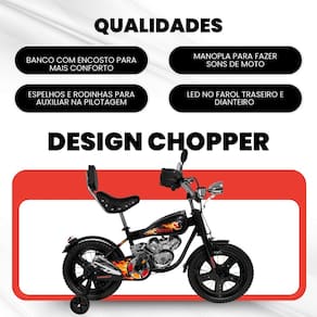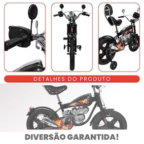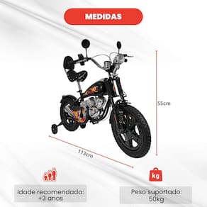 Principais Benefícios: - Design inspirado em motos Chopper – estilo único que desperta o interesse da criança - Rodas de apoio laterais – mais estabilidade e segurança para os primeiros passeios - Freios ferradura e tambor – dupla proteção para uma frenagem mais segura - Banco com encosto – conforto extra para trajetos mais longos - Protetor de corrente e paralamas – evita sujeiras e protege os pequenos durante o uso - Refletor traseiro e luz dianteira decorativa – visual moderno e chamativo - Ideal para 3 a 6 anos – acompanha a criança nas fases iniciais de aprendizado - Até 50 kg – suporta com tranquilidade o uso diário