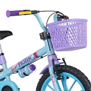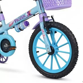 A aro 16” tem pneus com câmara, quadro em aço carbono e garrafinha.