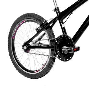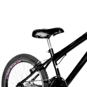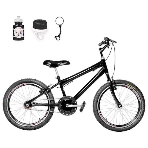 Conta com itens de segurança certificados pelo Inmetro, com banco (selim) confortável, protetor de coroa e freios v-brake de alta frenagem, além do aro aero que proporciona dupla resistência às rodas.
