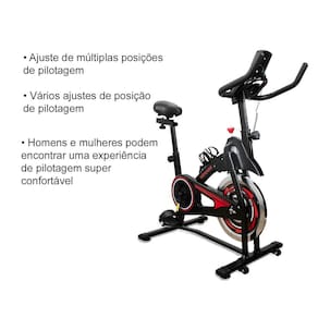 Cor: Preto Material: Ferro, plástico, espuma, couro sintético Tipo de bicicleta: Spinning Tipo de resistência: Mecânica Funções do display: Scan, tempo, velocidade, distância, calorias, hodômetro, batimentos cardíacos Alimentação do display digital: 2 pilhas AAA não incluídas Peso da roda da inercia: 15kg Peso máximo suportado: 150 kg