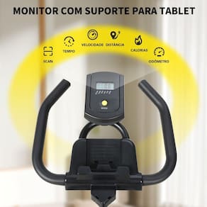 Display com funções essenciais: O painel digital exibe informações como tempo, velocidade, distância, calorias, modo SCAN e odômetro (ODO), auxiliando no monitoramento da performance durante os treinos.