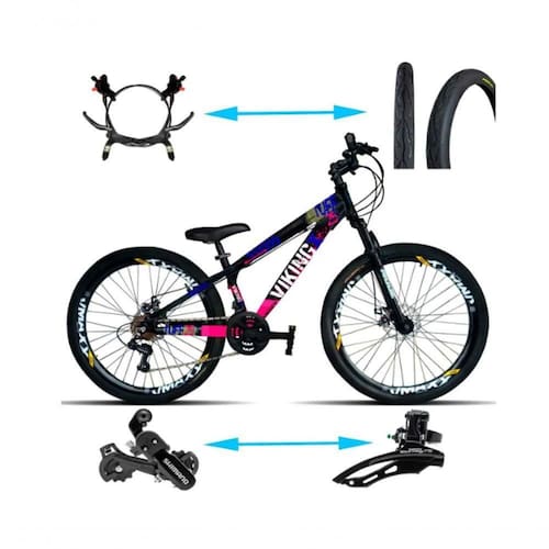 Bicicleta Viking Aro 26 Tuffx25/30 Vmaxx Freio Hidráulico 21v Preto Rosa Foi projetada para quem quer uma bike de personalidade e estilo inigualável. Ela oferece ao ciclista quadro diferenciado e design arrojado e exclusivo. Com qualidade, ela vem equipada de com 21 velocidades, permitindo ao ciclista a escolha da marcha ideal de acordo com o . O design moderno pode ser observado no quadro da bike e os pneus são confeccionados em mtb com aro 26, garantindo segurança total a cada manobra em qualquer tipo de terreno. QUADRO: VIKINGX Aluminio soldas reforçadas SUSPENSÃO: Importada DE MARCHAS: 21 velocidades ALAVANCA DE CÂMBIO: Rapid Fire 7 velocidades Index CÂMBIO DIANTEIRO: Shimano Tourney 3 velocidades Index CÂMBIO TRASEIRO: Shimano Tourney 7 velocidades Index CORRENTE: Comum 7 velocidades Index PEDIVELA: Triplo Aço Index RODA LIVRE : Comum 7 velocidades Index MOV. CENTRAL: Rolamentado CAIXA DE DIREÇÃO: AHEAD SET GUIDÃO: Comum SUPORTE DO GUIDÃO: Comum MANOPLA: Simples Mtb FREIO: A disco hidraulico PEDAL: Simples Mtb SELIM: Simples Mtb CANOTE DO SELIM: Aço AROS: VMAXX RAIOS: Preto em aço MONTAGEM: A bicicleta é montada e engraxada bem apertada, para acomodação na caixa, a roda dianteira, pedais e guidão são enviadas desmontadas. A montagem do guidão, pedais e roda dianteira, é de responsabilidade do cliente sendo necessário ser feita montagem em uma oficina especializada, para evitar danos ao produto na primeira montagem e conservar a da bike também é indispensável pedir ao mecânico realizar uma conferência do funcionamento dos câmbios e freios antes do uso e realizar a regulagem caso esteja desregulado. : NÃO COBRE DEFEITOS POR MAU USO OU PELA MONTAGEM / REVISÃO INADEQUADA DO PRODUTO. A Bicicleta possui de 90 dias nos componentes. A não se aplica para os itens de desgaste natural, tais como: Pneu, câmaras, cabos, sapatas de freio, centragem de aros, pintura do quadro, componentes da transmissão (corrente, engrenagens do pedivela, engrenagens do cassete ou roda livre ). Bicicletas montadas sem mão de obra especializada não se enquadram na ofertada pelo fabricante. Sendo obrigatório a primeira montagem dos componentes e conferencia das marchas ser realizada em oficina especializada e deve ser exigido a de serviço para se enquadrar na cobertura de . Afim de certifica-se que a bicicleta foi montada por mão de obra especializada.