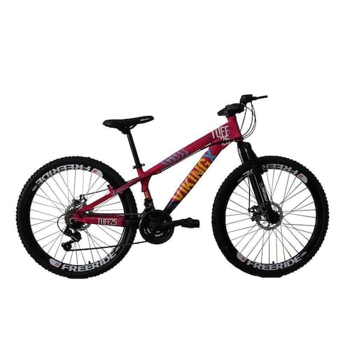Bicicleta Viking X Tuff25 Freeride Aro 26 Freio A Disco Bicicleta Viking X TUFF25 Freeride Aro 26 Freio a Disco 21 Velocidades Cambio Shimano Traseiro Dianteiro Importado Rosa Roxo - Vikingx ; Foi projetada para quem quer uma bike de personalidade e estilo inigualável. Ela oferece ao ciclista quadro diferenciado e design arrojado e exclusivo. Com qualidade, ela vem equipada de com 21 velocidades, permitindo ao ciclista a escolha da marcha ideal de acordo com o local. O design moderno pode ser observado no quadro da bike e os pneus são confeccionados em MTB com aro 26, garantindo segurança total a cada manobra em qualquer tipo de terreno. Informções técnicas: - Marca: Viking - Coleção / Sortimento: 2017 - Idade recomendada: Juvenil/Adulto - Gênero: Unissex - Aro: 26 - Quadro: Aluminio - Marcha: 21 Marchas - Garfo: Suspensão - Guidão: Aço carbono MTB - Freios: Disco - Rodas: Freeride - Cambios: Shimano - Manoplas: MTB - Corrente: Index - Selim: MTB Preto - Trocador de marcha: Rapid fire - Pedivela: Importado - Pneus: MTB 26" - Pedal: Plástico MTB - Dimensões 1,20x0,70x25 - Peso 15,9kg Conteúdo da Embalagem: 1 Bicicleta, manual de Instruções Garantia do Fornecedor: 3 Meses Modelo: MTB Freeride