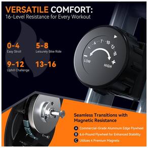 A resistência magnética de nível 16 para o melhor controle de treino, leve seu treino para o próximo nível com o sistema de resistência magnética de bicicletas 16 lados! Equipado com quatro ímãs de alto grau e um volante de alumínio de 2,99 quilos, esta bicicleta interna fornece ajustes de resistência sem costura e sussurros