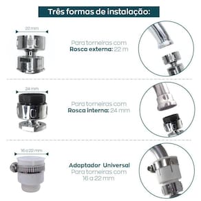 Possui 3 formas de instalação dependendo da sua torneira acompanha manual 1 - torneiras com rosca externa: 22 mm de diâmetro não necessita do adaptador universal 2 - torneiras com rosca interna: 24 mm de diâmetro usar o adaptador de rosca 3 - utilização com o adaptador universal: 16 mm - 24 mm de diâmetro Diâmetros de encaixe encaixa em torneiras com diâmetro de 16 mm - 24 mm