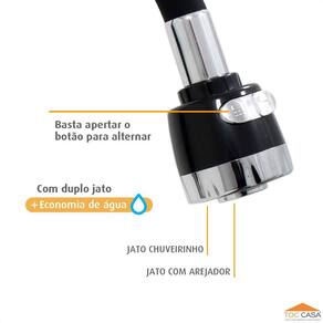 Possui regulagem de Jato com botão de acionamento simples e pratico que permite alternar o jato de água entre continuo concentrado e chuveirinho, possibilitando o direcionamento de água otimizando seu uso, além do belo design é extremamente funcional para o dia a dia e de fácil instalação.