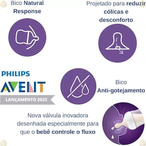 Bico Natural Response que possui a válvula desenhada especialmente para que o bebê controle o fluxo. Única válvula capaz de interromper totalmente o fluxo quando o bebê para de sugar.