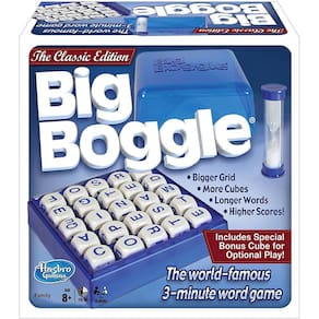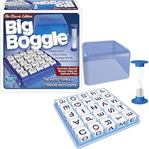 Boggle, o mundialmente famoso jogo de palavras de 3 minutos está agora disponível como "Big Boggle. O novo cubo "Double Letter" facilita a formação de palavras mais longas. Este jogo contém uma grade maior, mais cubos e permite pontuações mais altas. Para 2 ou mais jogadores.