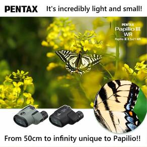 Pentax Papilio III 8.5x21 WR Verde-oliva, foco próximo de 50 cm até o infinito, corpo resistente às intempéries, novo revestimento HD, ideal para observar objetos pequenos, para viagens, caminhadas, shows, esportes e observação de estrelas.