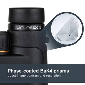 - Prismas BaK-4 para uma experiência de visualização ideal: os prismas dentro da Nature DX apresentam vidro BaK-4 de qualidade com revestimentos de fase aplicados para maximizar a transmissão de luz e melhorar imagens brilhantes e altamente detalhadas.
