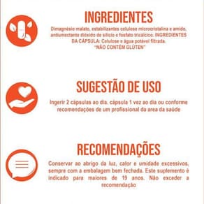 Valor energético: 3 kcal = 13 kj 0% Carboidratos: 0,7g 0% Magnésio: 260mg 62% VD Recomendação de uso: Ingerir 2 cápsulas ao dia.