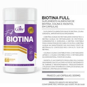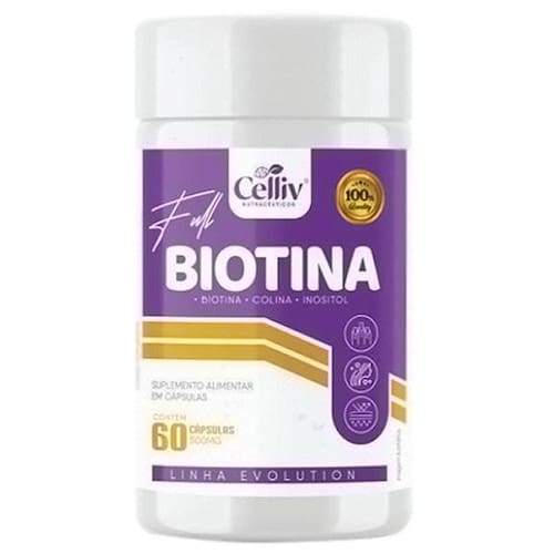 Biotina full 60 caps 500 mg - biotina, colina e inositol celliv Biotina full 60 caps 500 mg - biotina, colina e inositol celliv Composição: Biotina, colina e inositol Cápsulas: gelatina e umectante glicerina Como tomar Recomendação de uso: A recomendação do fabricante é tomar de 1 cápsula por dia. ou conforme indicação do médico ou nutricionista. Importante: Este produto é um suplemento e não um medicamentoPortanto seu consumo pode ser diário e contínuo. Observação: O biotina full é um tratamento natural e seu efeito inicia normalmente após alguns meses de uso. Contra indicação: Sensibilidade ou alergia ao componentes do biotina full, distúrbios hemorrágicos, que usam medicamentos anti coagulantes. Pessoas com alergias a algum componente da formula ou problemas graves de saúde.Crianças, gestantes, idosos e portadores de qualquer enfermidade devem consultar o médico e/ou nutricionista.Este produto não substitui uma alimentação equilibrada e seu consumo deve ser orientado por um nutricionista e/ou médico. Anvisa: registro isento conforme resolução rdc 27 de 06 de agosto de 2010 anexo i. Marca: Celliv