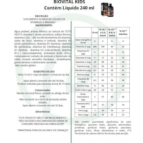 Multivitamínico - Líquido - Fórmula 100% desenvolvida pensando na saúde da criança! Ingredientes e dosagens exclusivas. Deixe sua saúde e imunidade do seu filho em dia com o novo BIOVITAL KIDS SABOR TUTTI-FRUTTI, da Bioklein.