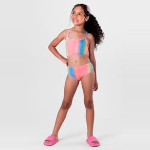 Estilo e proteção ao sol com o biquíni infantil menina beach wear composto por top e calcinha em malha UV de alta qualidade proporcionando uma camada extra de proteção contra os raios solares, garantindo que sua pequena aproveite o sol com segurança. O top possui alças finas com X nas costas, decote canoa frontal e estampa rotativa foil, já a calcinha também com estampa rotativa foil. Aposte!