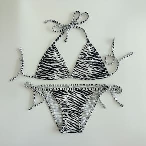 Biquíni modelo cortininha com estampa zebra em preto e branco. Possui amarrações laterais e no pescoço, permitindo ajuste perfeito ao corpo. Tecido leve, confortável e com ótima elasticidade. Ideal para praia, piscina e looks modernos de verão.