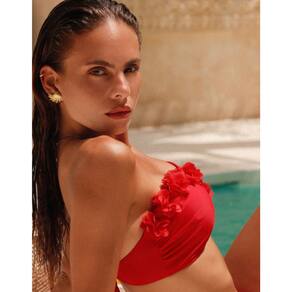 Lindo Biquini, de alta qualidade, com bojo de preenchimento removível, sutiã sem armação, decote bandeau, franzido floral 3D. Aproveite o verão 2026, férias, praia e piscina, com esse biquini de alta elasticidade, estilo sensual. Composição do tecido: 80% poliamida e 20% elastano. Cor: Vermelho Tamanhos: P, M e G