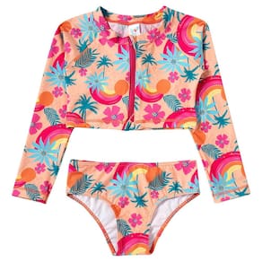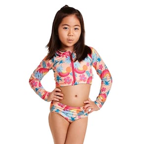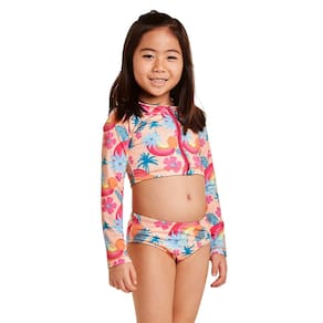 Com proteção solar permanente (FPS 50+) design moderno e confecção em tecidos leves, o biquíni cropped manga longa com zíper frontal da coleção Tropical Tucando Laranja Claro da Tip Top possui modelagem moderna e ótimo caimento com máximo de conforto para as meninas.