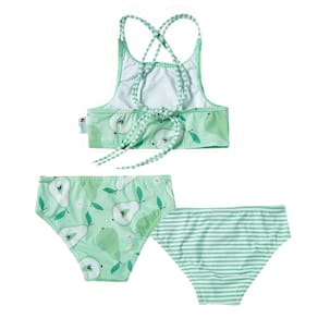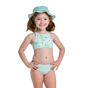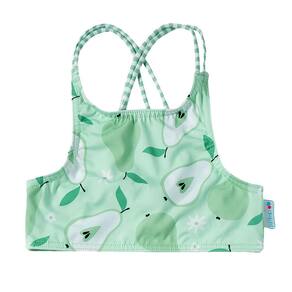 1 Biquíni Infantil, 2 looks! Conjunto de biquíni com 3 peças. Com o Trio composto de um top e duas calcinhas, sendo uma com a mesma estampa do top, e outra listrada de verde e branco, este biquíni infantil de peras da Tip Top é de arrasar. Possui proteção solar FPS 50+ permanente, para as meninas poderem aproveitar o verão com total segurança e conforto.